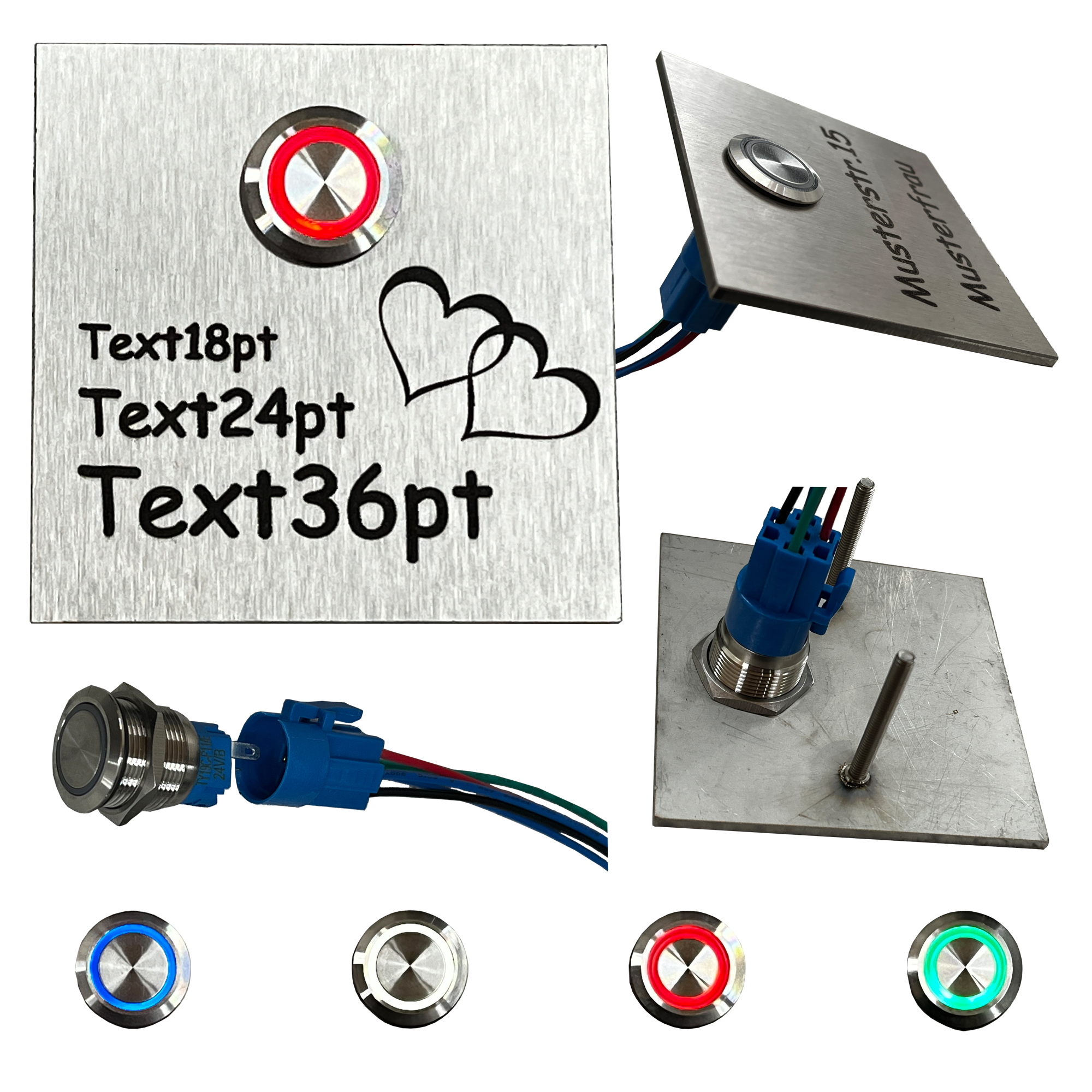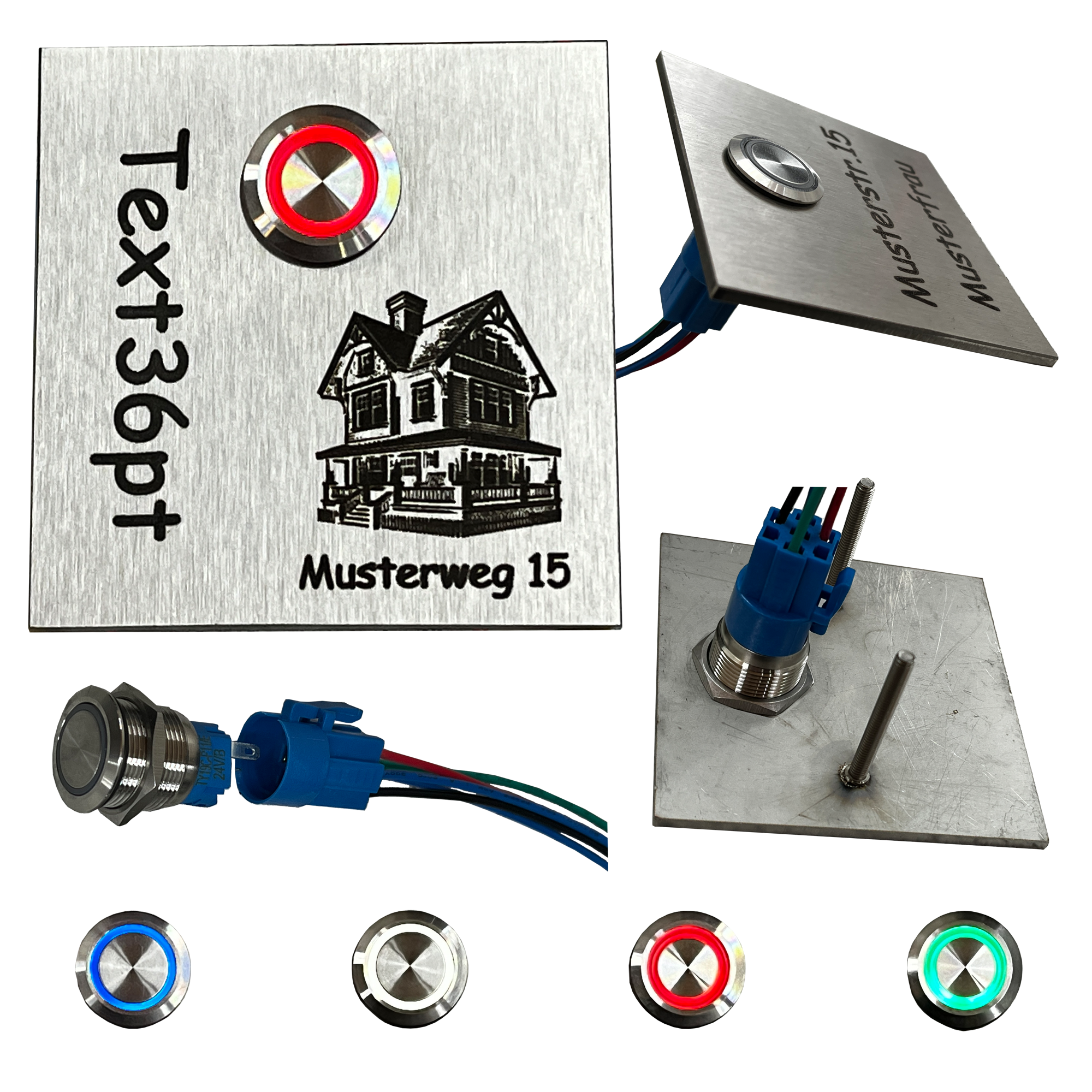Edelstahl Klingel Türklingel 8x8 cm LED - rot mit Text Gravur mit Grafik Gravur V2A Klingelplatte LED Beleuchtung