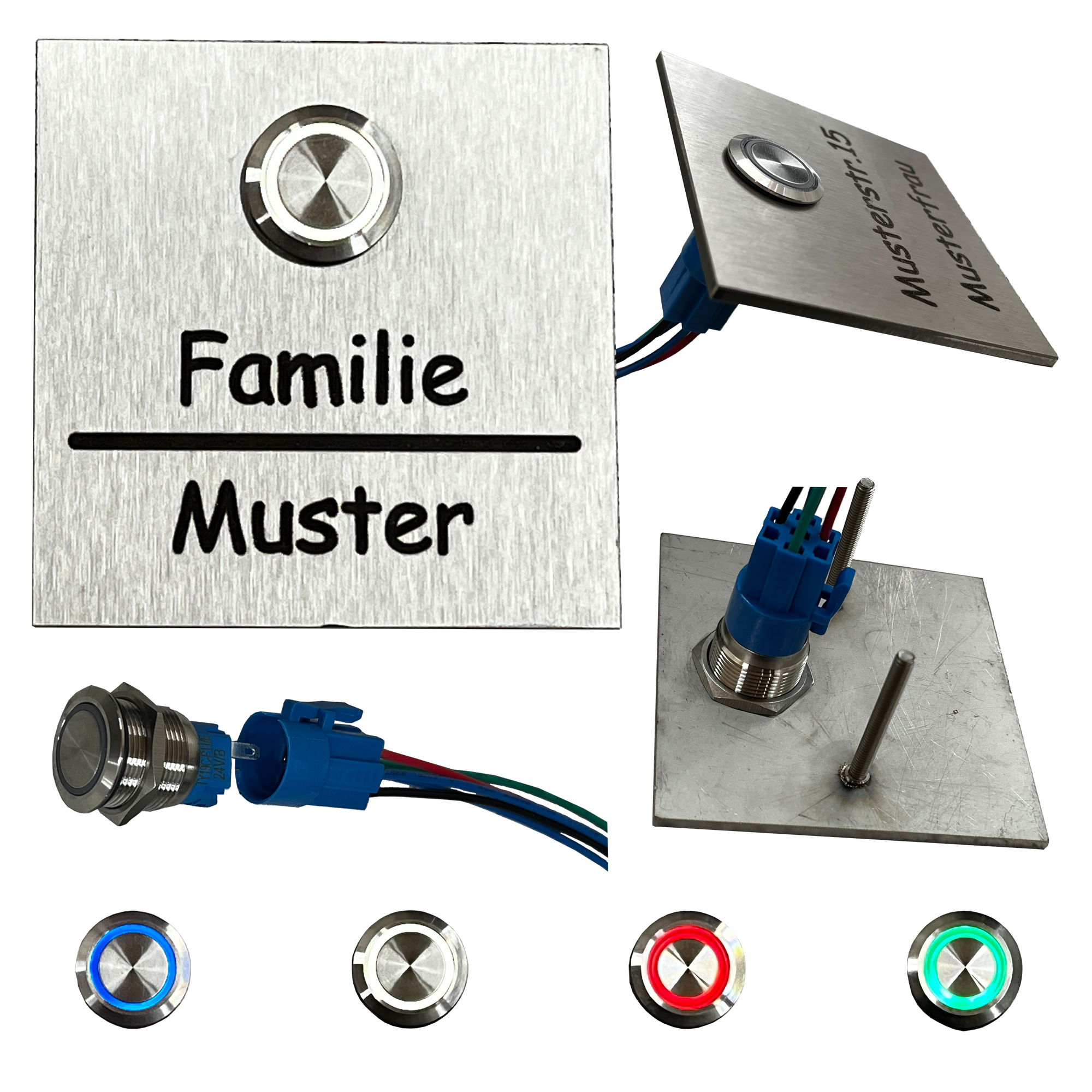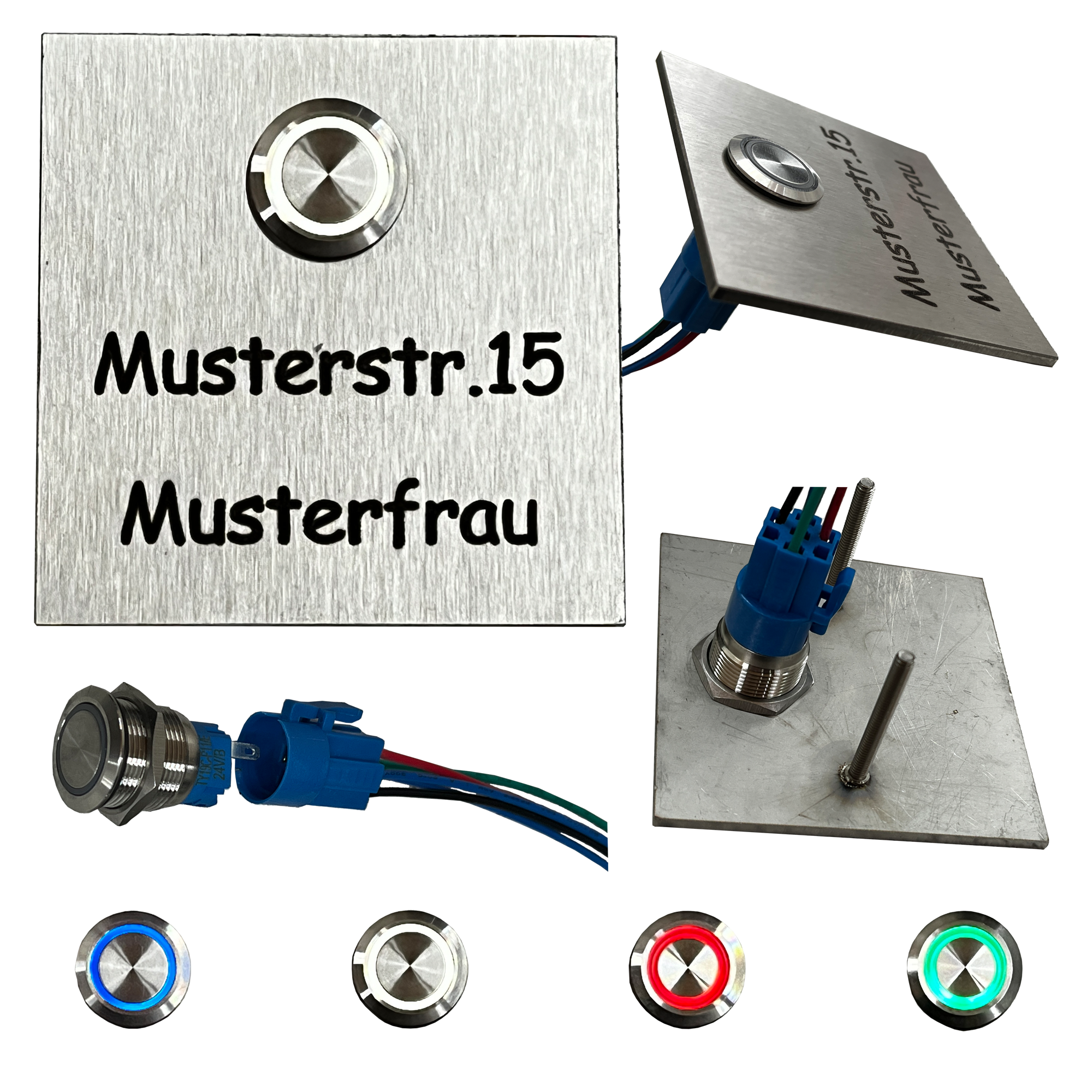 Edelstahl Klingel Türklingel 8x8 cm LED - weiss mit Text Gravur ohne Grafik Gravur V2A Klingelplatte LED Beleuchtung