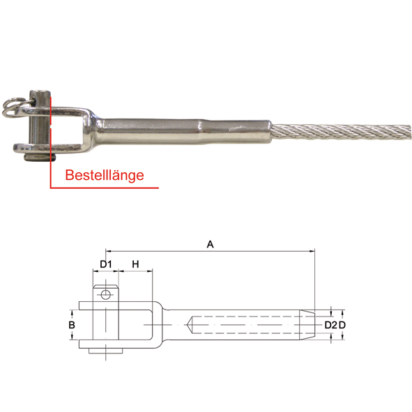 Bitte beachten Sie, dass dieser Terminal mit dem Drahtseil verpresst wird. Geben Sie bitte bei Ihrer Bestellung die gesamte Drahtseillänge vom Verpresspunkt des Terminals an. Der Preis für das Verpressen des Terminals mit dem Seil ist bereits im Preis enthalten! Das Seil muss separat bestellt werden