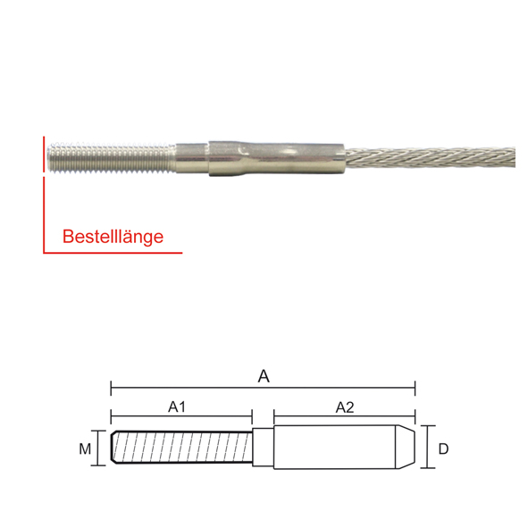 Bitte beachten Sie, dass dieser Terminal mit dem Drahtseil verpresst wird. Geben Sie bitte bei Ihrer Bestellung die gesamte Drahtseillänge vom Verpresspunkt des Terminals an. Der Preis für das Verpressen des Terminals mit dem Seil ist bereits im Preis enthalten! Das Seil muss separat bestellt werden