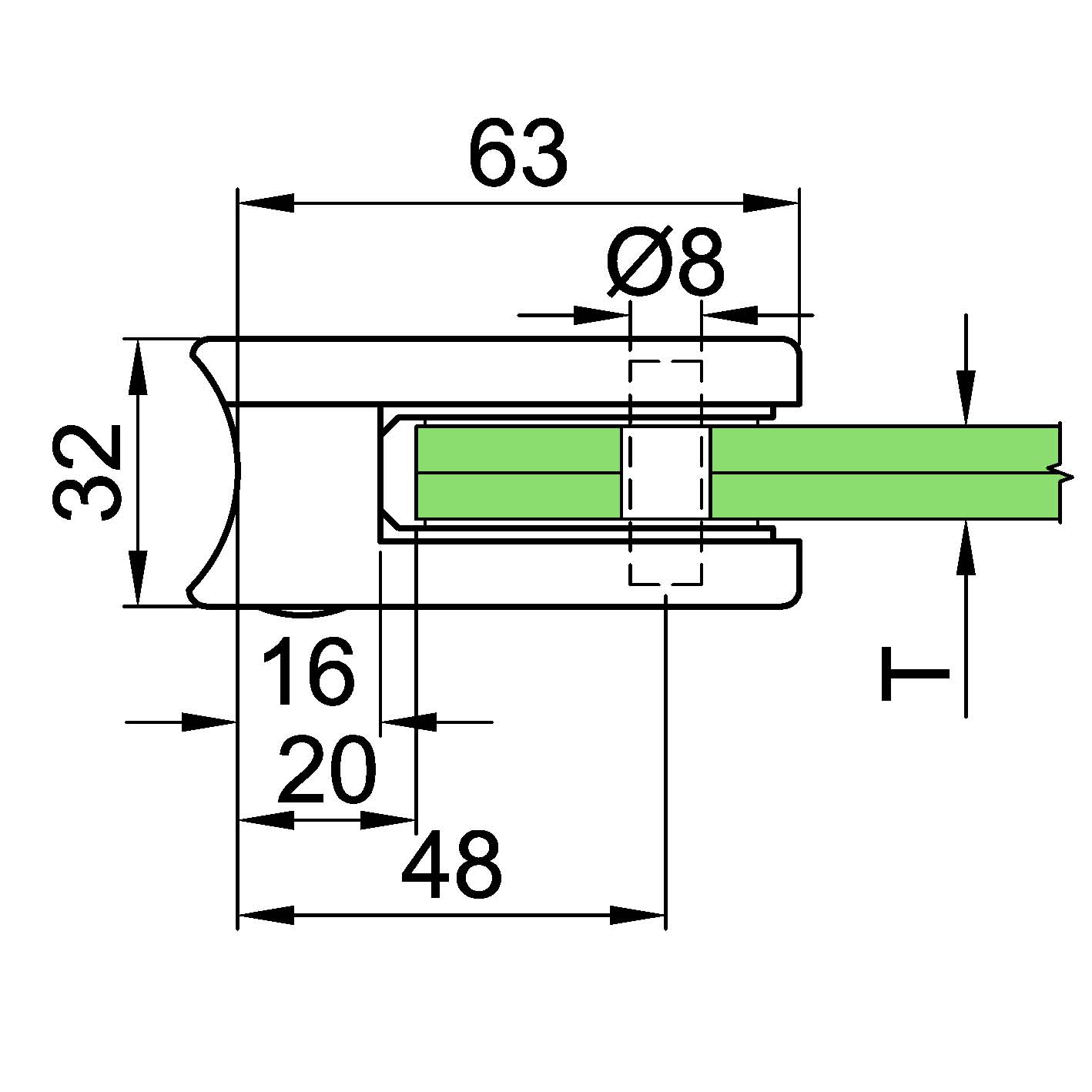 Befestigung mit Zylinderkopfschraube DIN912 M8 x 20 (nicht im Lieferumfang)