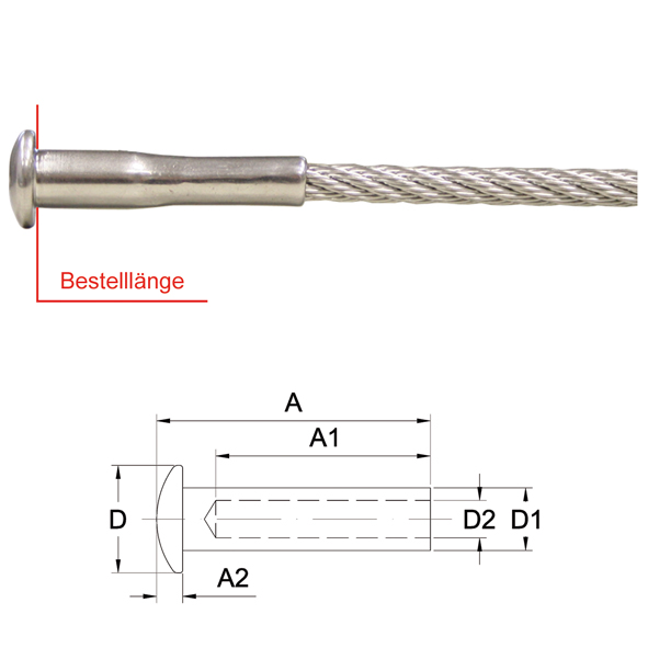 Bitte beachten Sie, dass dieser Terminal mit dem Drahtseil verpresst wird. Geben Sie bitte bei Ihrer Bestellung die gesamte Drahtseillänge vom Verpresspunkt des Terminals an. Der Preis für das Verpressen des Terminals mit dem Seil ist bereits im Preis enthalten! Das Seil muss separat bestellt werden